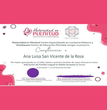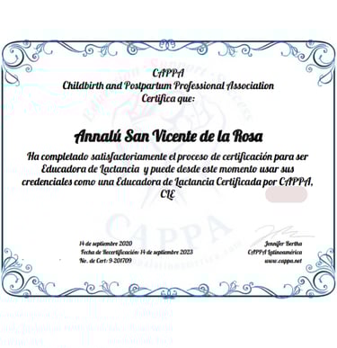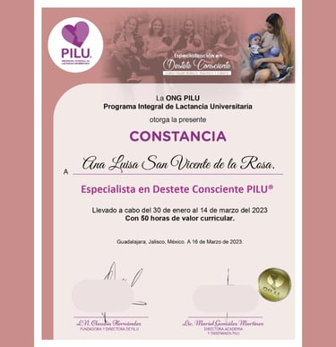 Decidí certificarme profesionalmente, en primera instancia, como Educadora de Lactancia y posteriormente como Asesora y Consejera. Todos los años me mantengo actualizada para poder brindarte la información y acompañamiento necesario que te ayuden a alcanzar las metas de lactancia que TÚ tenías planeadas.